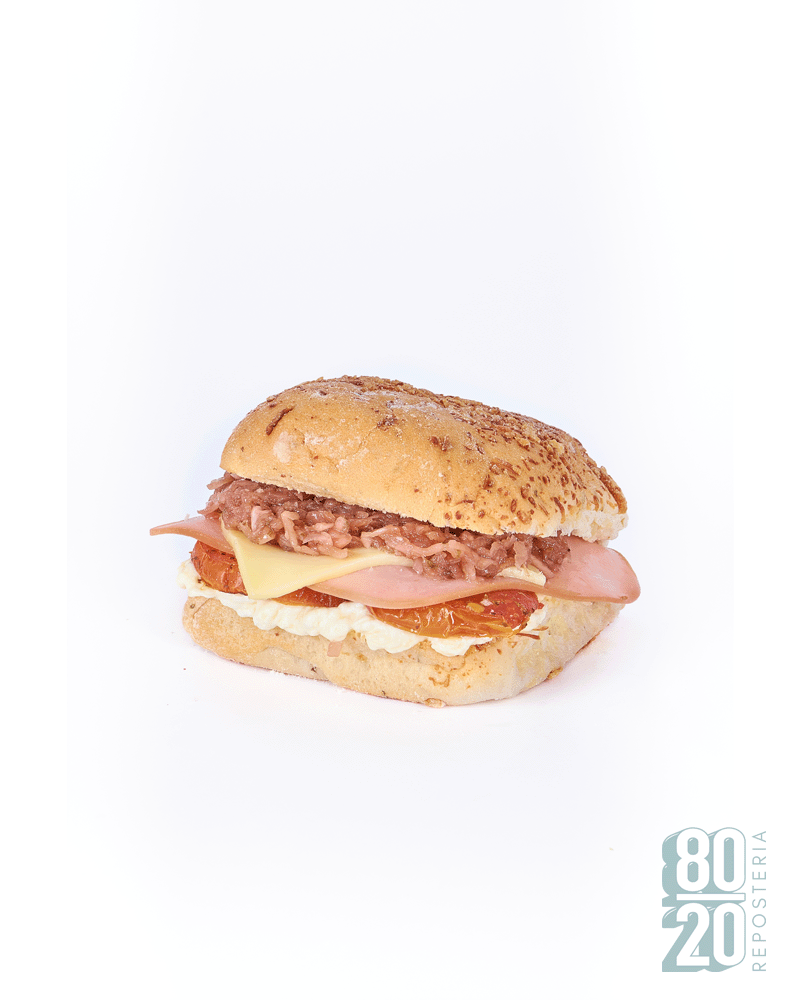 Pan oregano parmessano 10×10 cms, jamón de cerdo, queso mozarella, queso crema, queso parmessano, cebolla en balsamico y tomate deshidratado en envoltura en papel antigraso
